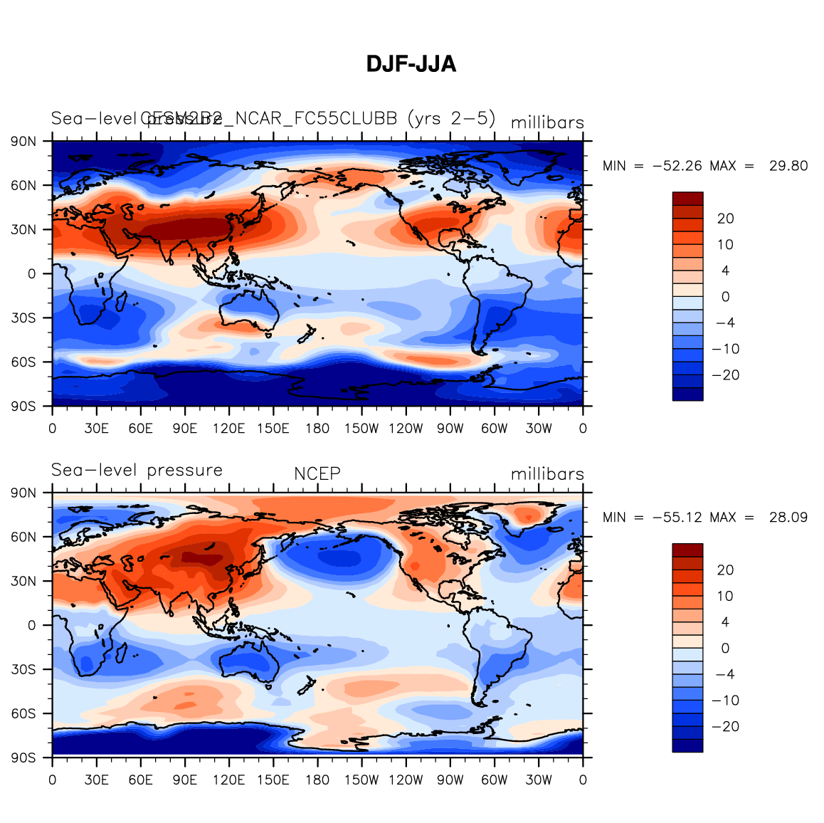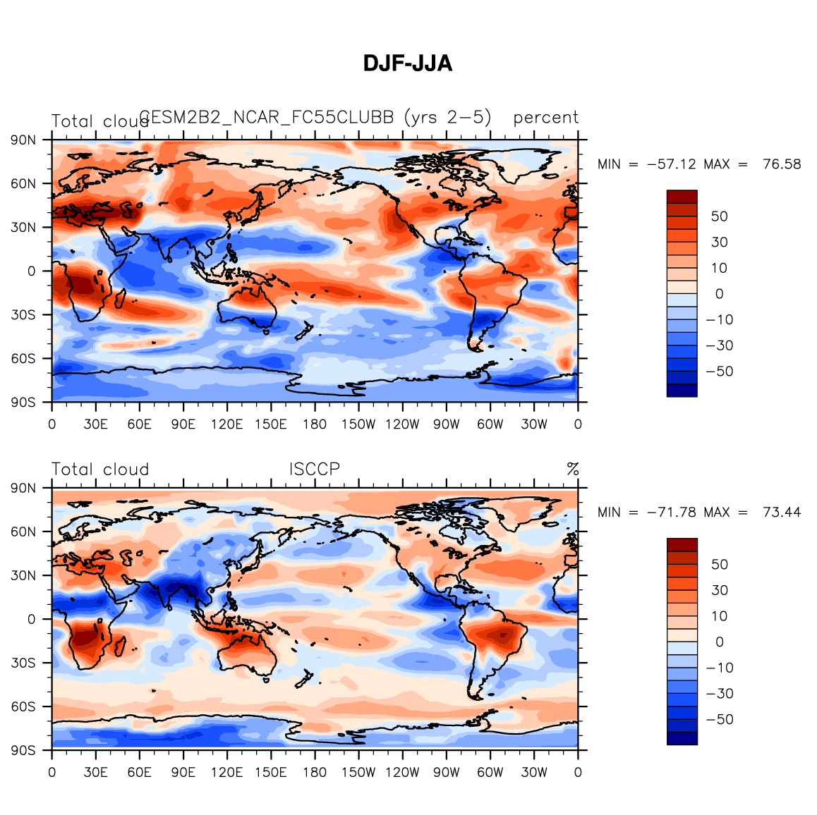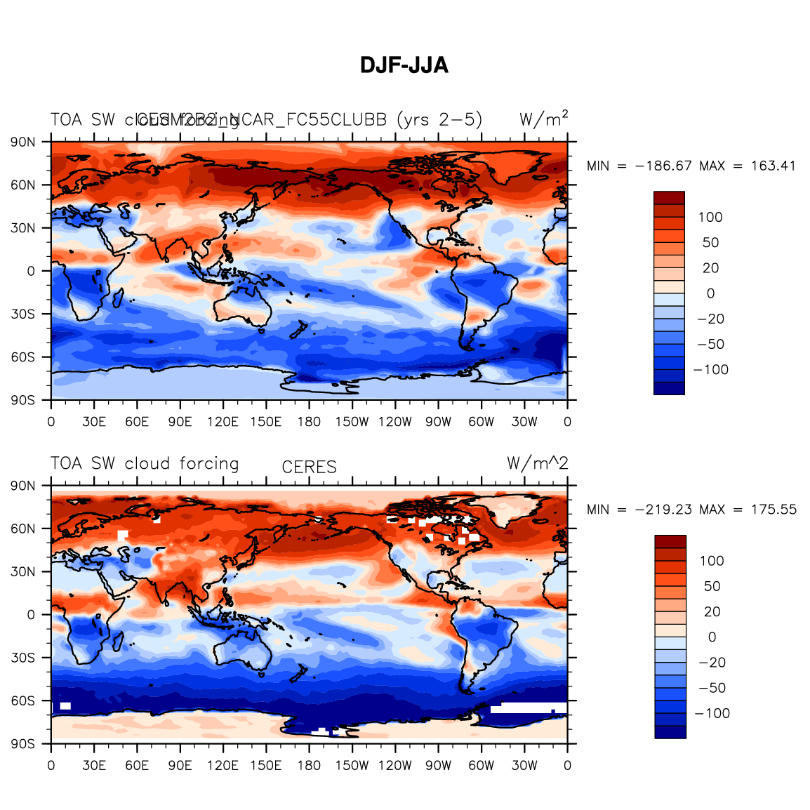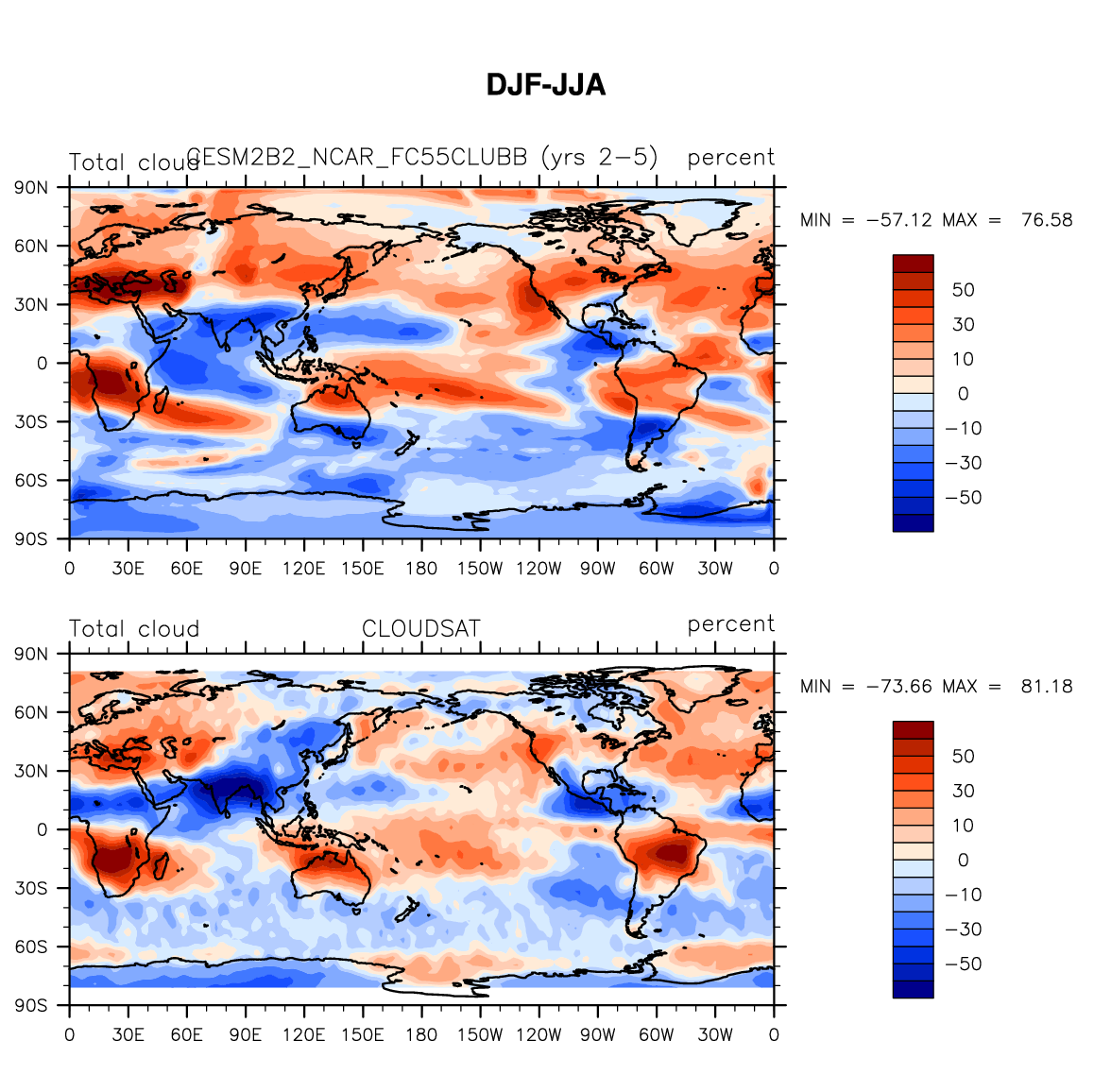 CESM2B2_NCAR_FC55CLUBB DIAG Set 9 - Horizontal contour plots of DJF-JJA differences