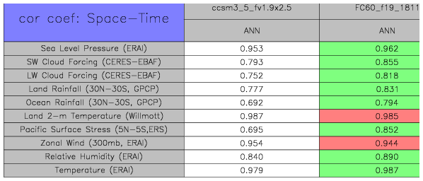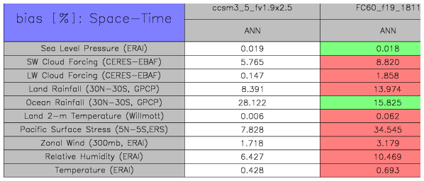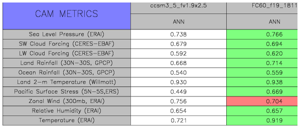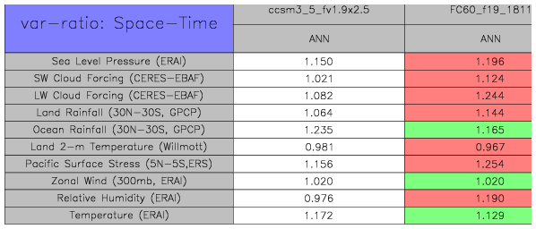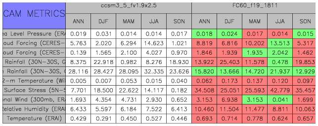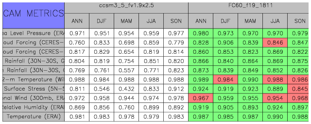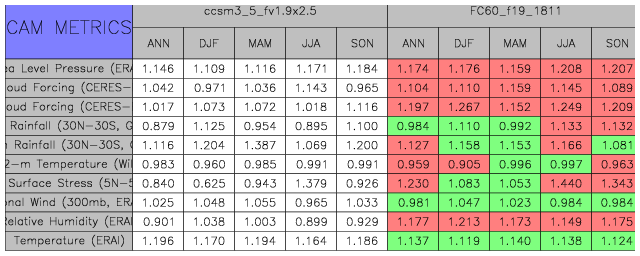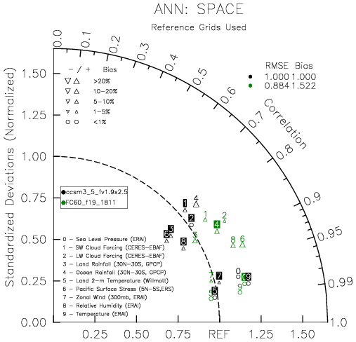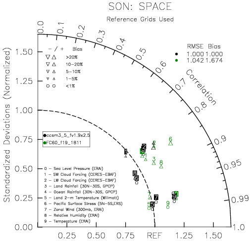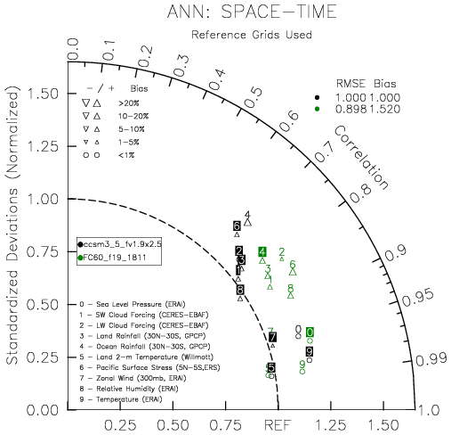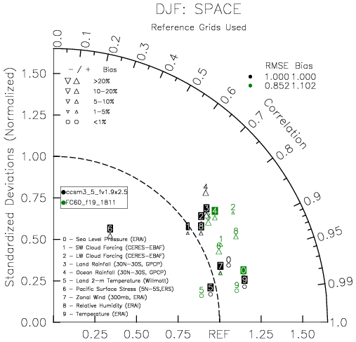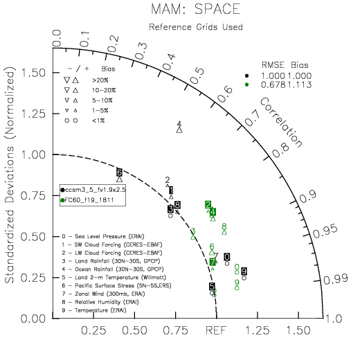 Taylor Diagrams were developed by Karl Taylor at PCMDI (paper|tech note) and aim to condense information about variance and RMSE characteristics of a particular model run when compared with observations in a single diagram. The tables summarize the individual metrics for each variable considered including: