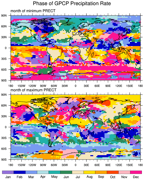| Precipitation Rate Month of Max and Min | NFHISTfrc2_f09_mg17_20191107 | GPCP | CAM3 T42 | CAM3 T85 |