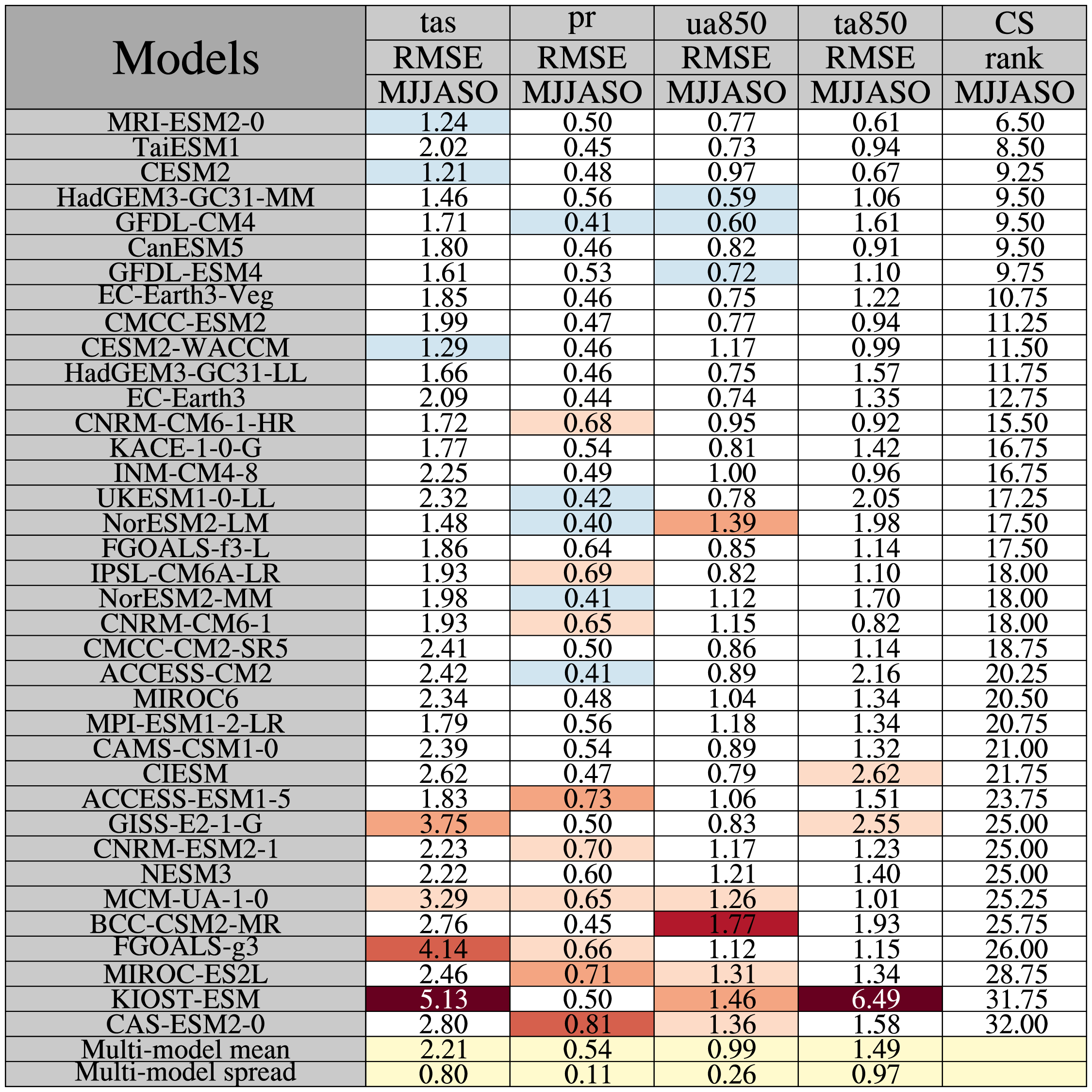 Red/blue background indicate that the RMSE/bias/correlation values differ from the multi-model values by more than one one standard deviation, with red indicating that the values exceed the multi-model mean by one standard deviation more more and blue indicates that the values are too small by one standard deviation or more. The larger the discrepancy with respect to the multi-model values, the darker the colors.